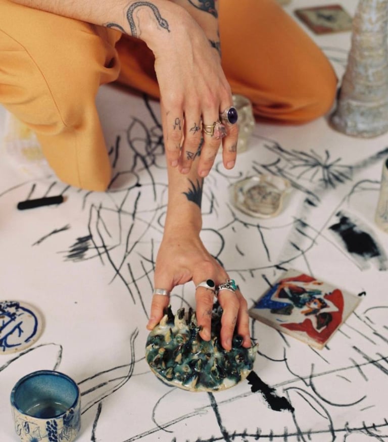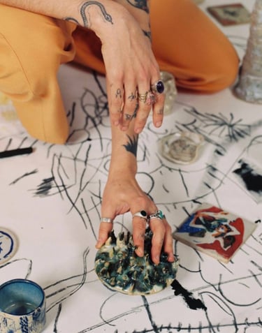 devorah livadna (she/they) is an artist whose work and interests span over many disciplines, such as analog printing, painting, illustration and ceramics. their current focus is on using clay and pigment to visually weave their personal story, explorations and impressions by blending playful designs and organic forms.